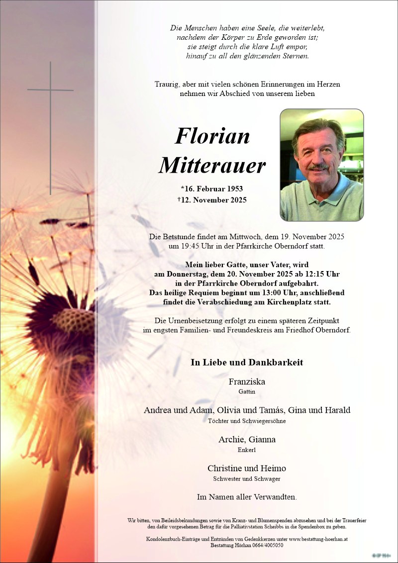 Lieber Florian! Wir alle werden dich mit deinem einzigartigen Wesen in unserer Erinnerung bewahren. Liebe Franziska und liebe Trauerfamilie! Der wunderbare Spruch auf der Parte sagt eigentlich alles. Florian wird in seiner Familie weiterleben, das werdet ihr auf Schritt und Tritt spüren. Viel Kraft aber beim “Loslassen” ins ewige Glücklichsein. Aufrichtige Anteilnahme, wir denken ganz fest an euch ! Familie Dr. Johannes Wald