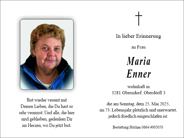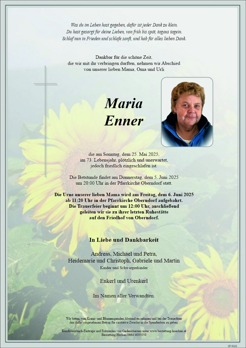Maria Enner, geb. Kastenberger, oder „Mitzi“ wie sie viele nannten, wurde am 23. April 1953 als jüngstes von vier Geschwistern geboren. Ihren um 19 Jahre älteren Bruder „Lois“ hat sie immer väterlich wahrgenommen – er war schon ausgezogen und hatte davor noch einen Nussbaum hinter dem Haus gepflanzt, der ihr ihr Leben lang sehr wichtig war. Ihre ältere Schwester „Minnerl“ war ebenfalls schon früh aus dem Haus in ihr eigenes Leben aufgebrochen und auch ihre Schwester „Annerl“ verließ das Haus, als Maria noch jung war.