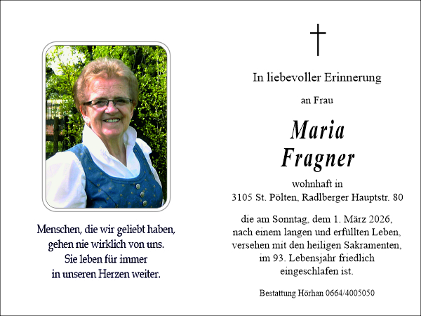 Ich bin froh das ich Maria am 28. 02. 2026 in RADLBERG noch besuchen konnte, sie hatte mich gleich erkannt und war sehr erfreut das ich noch zur ihr gekommen bin.
