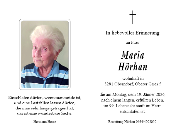 Herzliche Anteilnahme Hedwig Oberforster, Ternbergentzündet am 20.01.2026